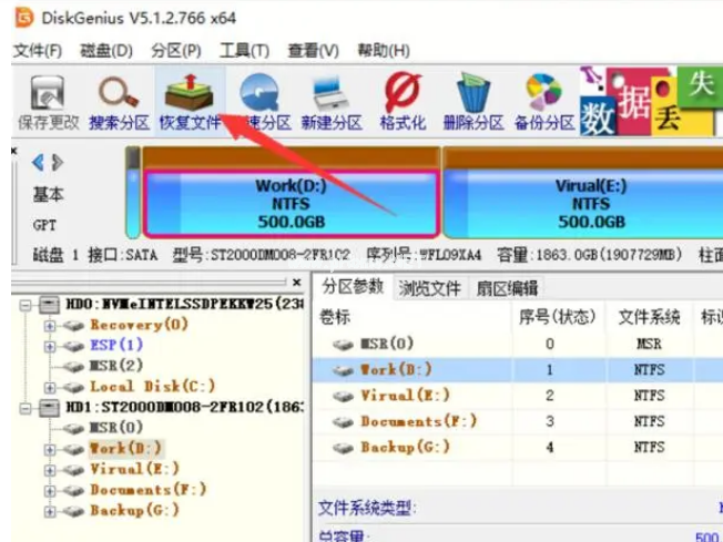 1、運行DiskGenius軟件,選擇需要恢復文件的分區(qū),點擊“恢復文件”按鈕。