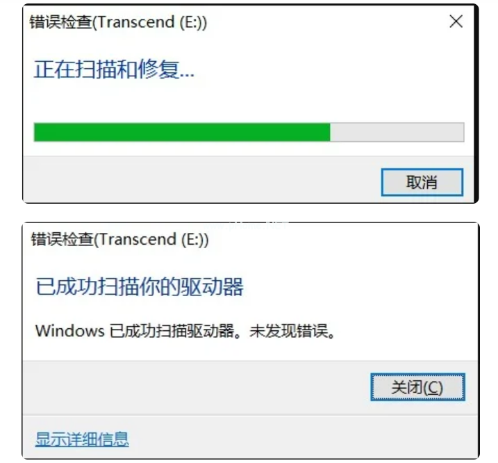4、磁盤掃描修復完成后,確認磁盤掃描修復結(jié)果。
