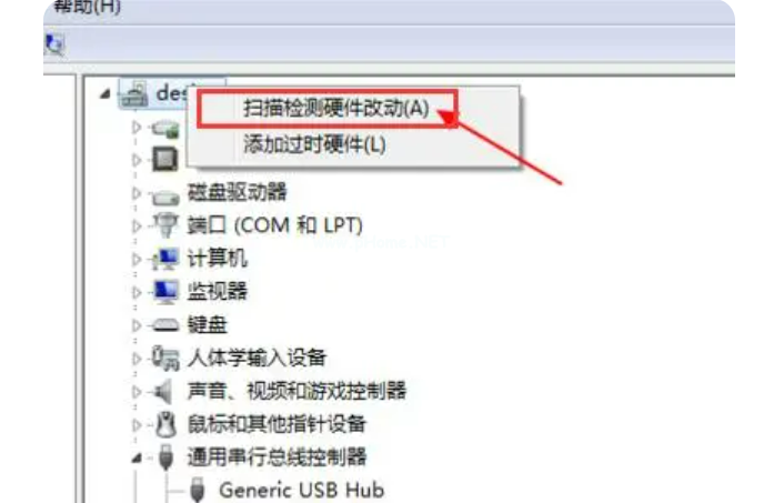 5、卸載完成后再右擊選擇計(jì)算機(jī)名,選擇“掃描檢測(cè)硬件改動(dòng)”即可。