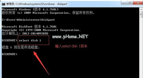 3.再輸入“select disk 1”命令(注意:寫1就是一個u盤,兩個就寫2,以此類推)。