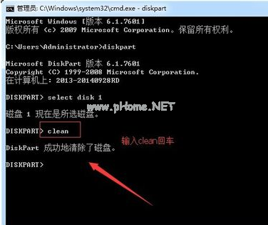4.選擇完成磁盤后繼續(xù)輸入命令“clean”刪除u盤的所有信息。