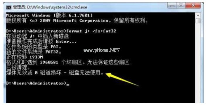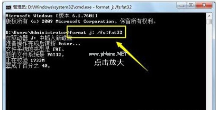 2、接著輸入“format j: /fs:fat32”(其中j代表U盤所在盤符)并按回車鍵執(zhí)行U盤格式化操作。