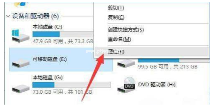 1、插入u盤,打開我的電腦,右擊U盤盤符,在彈出的右鍵菜單中選擇“屬性”。