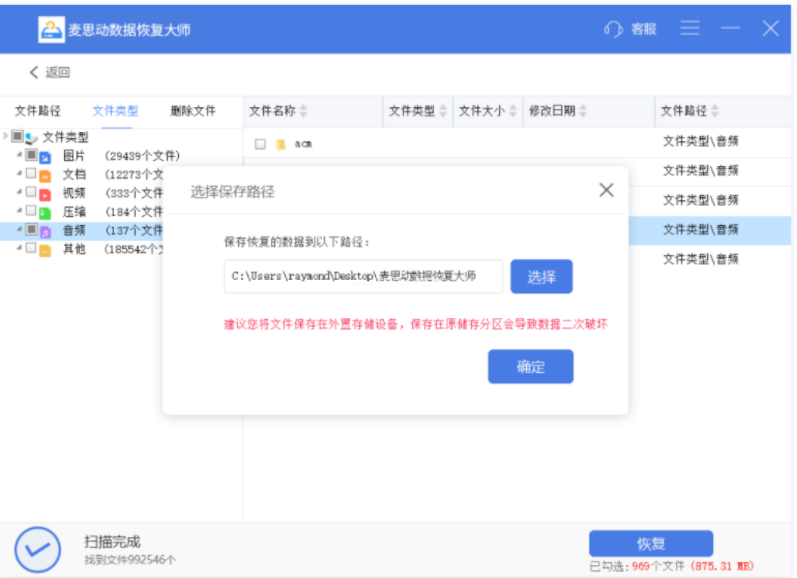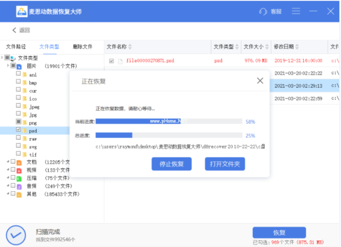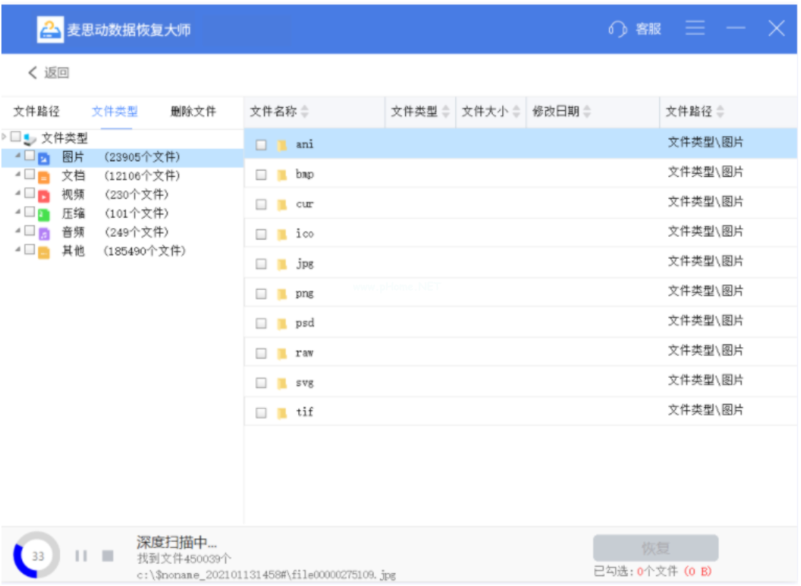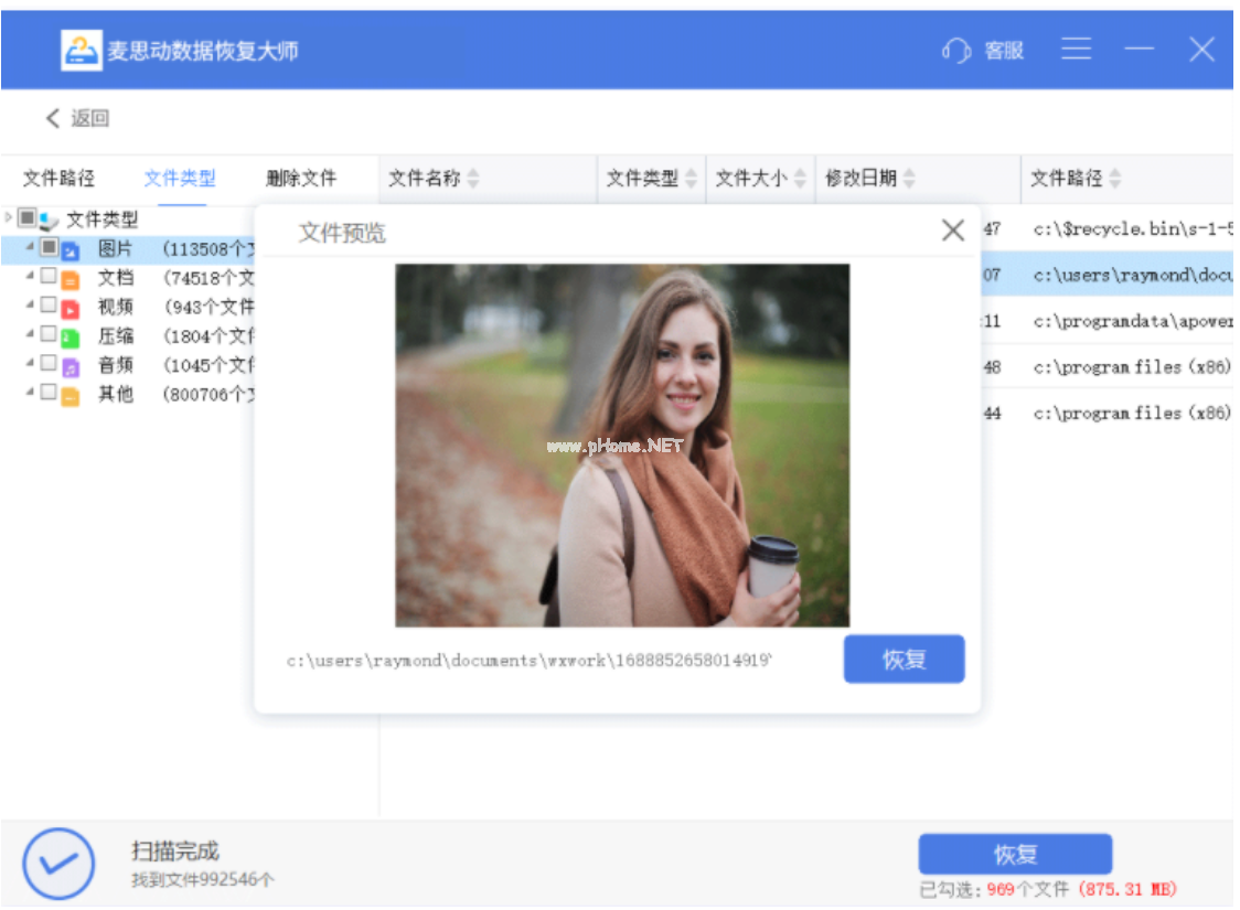 4、此時(shí)軟件會(huì)自動(dòng)掃描,掃描完成后會(huì)出現(xiàn)可以恢復(fù)的文件列表,勾選需要恢復(fù)的文件,點(diǎn)擊恢復(fù)即可。