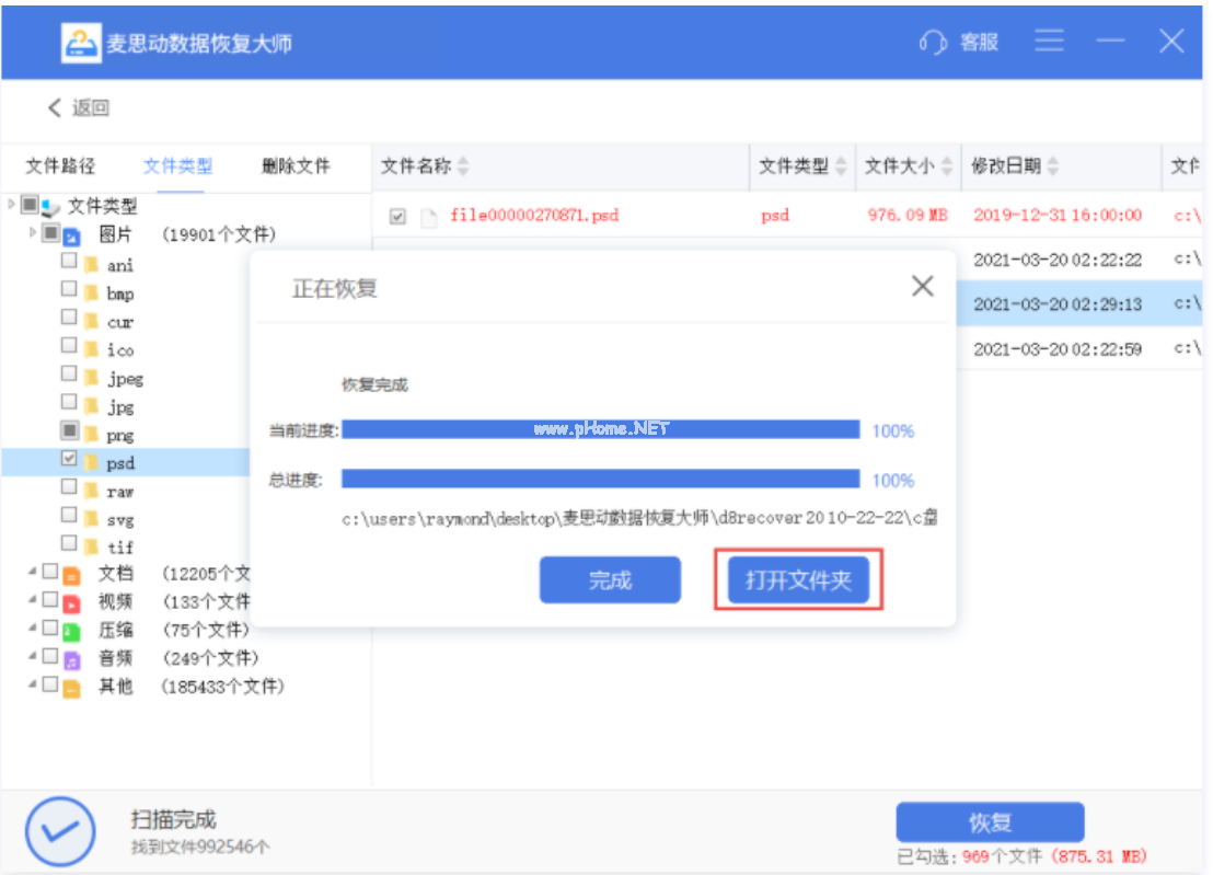7、當(dāng)電腦提示恢復(fù)完成后,鼠標(biāo)點(diǎn)擊【打開文件夾】查看恢復(fù)的文件,或者點(diǎn)擊完成即可。