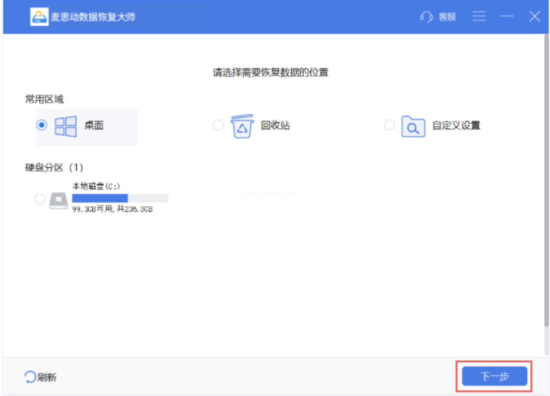 1、下載安裝麥思動(dòng)數(shù)據(jù)恢復(fù)大師并打開,選擇我們需要恢復(fù)數(shù)據(jù)的位置,點(diǎn)擊【下一步】。