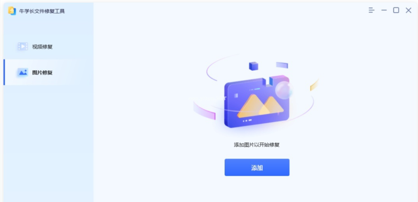 1、在電腦上下載并安裝牛學(xué)長文件修復(fù)工具,目前有“照片修復(fù)”和“照片修復(fù)”兩個修復(fù)功能模塊,選擇點擊“照片修復(fù)”功能,然后點擊“添加”或直接拖入添加照片,都可批量添加照片。