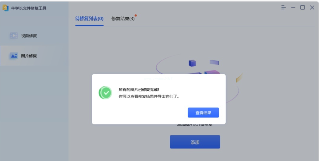 3、等待照片修復(fù)成功后,將會彈出“所有的照片已修復(fù)完成!”的彈框,點擊“查看結(jié)果”將會跳入到“修復(fù)結(jié)果”界面,即可點擊照片在線預(yù)覽修復(fù)效果。