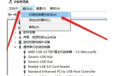 6、這樣我們點擊“操作”,彈出“掃描檢測硬件更改”;