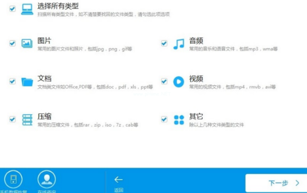 3、選擇需要恢復(fù)的數(shù)據(jù)類型