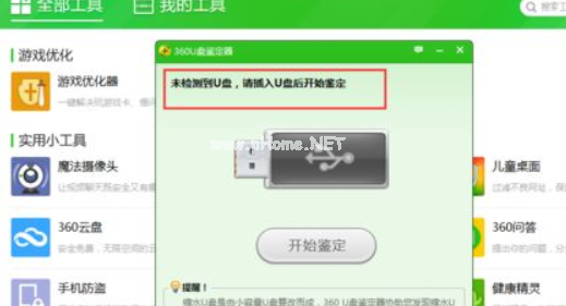 2、添加“U盤鑒定器”以后,此時(shí)會(huì)彈出“未檢測到U盤,請插入U(xiǎn)盤后開始鑒定”提示,然后插入U(xiǎn)盤,選擇“開始鑒定”。
