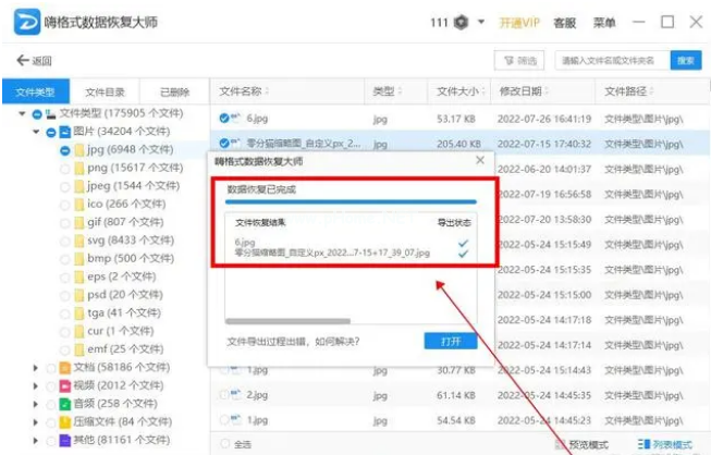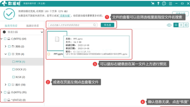 2、查看文件類型并選擇要恢復(fù)的文件。文件的查看可以在篩選框里面指定文件名搜索,或者在頁面左側(cè)點擊查看文件。你還可以鼠標(biāo)右鍵懸放在某一文件上方進(jìn)行預(yù)覽,就能看到它的詳細(xì)信息。確認(rèn)信息無誤,點擊“恢復(fù)”就可以了。