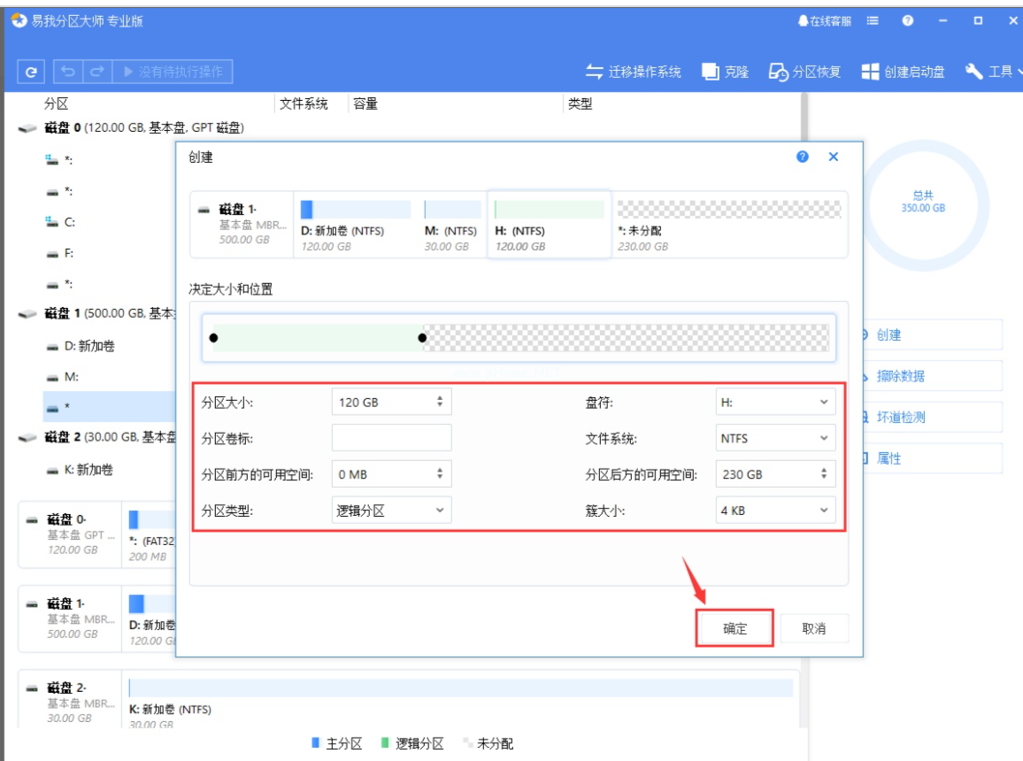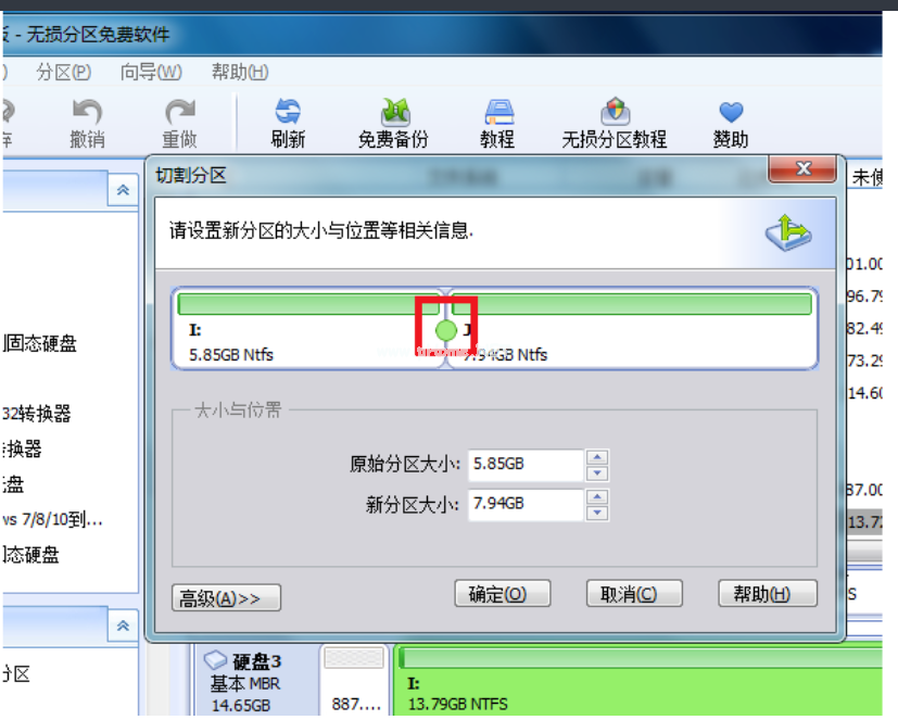 2、進(jìn)入新的窗口,使用鼠標(biāo)拖動(dòng)調(diào)節(jié)按鈕,設(shè)置新分區(qū)的大小與位置,進(jìn)行切割分區(qū),調(diào)整完畢,點(diǎn)擊確定按鈕。