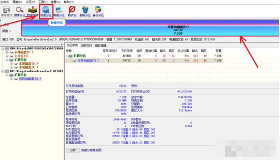 2、使用DiskGenius的【快速分區(qū)】。選中U盤,然后在菜單欄中單擊【快速分區(qū)】。