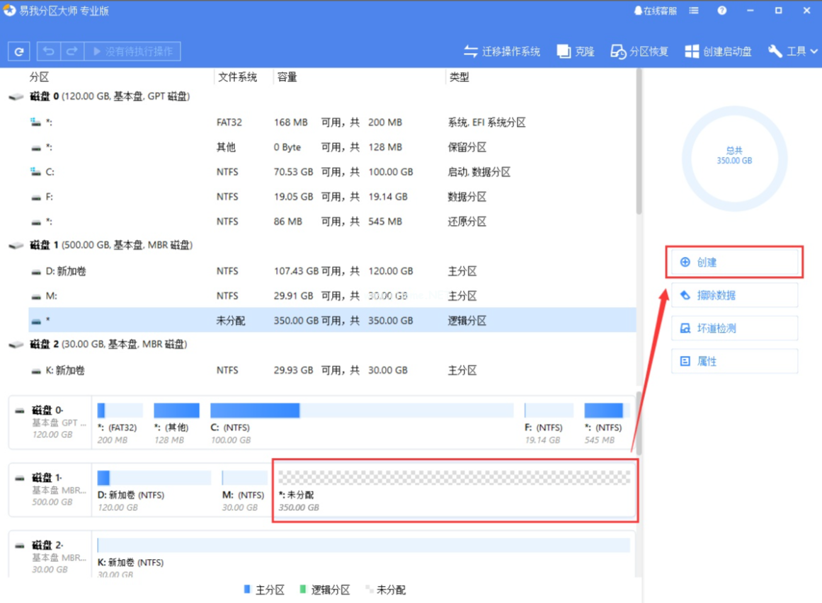 4、選中磁盤上的未分配空間,在右側(cè)功能列表中選擇“創(chuàng)建”。