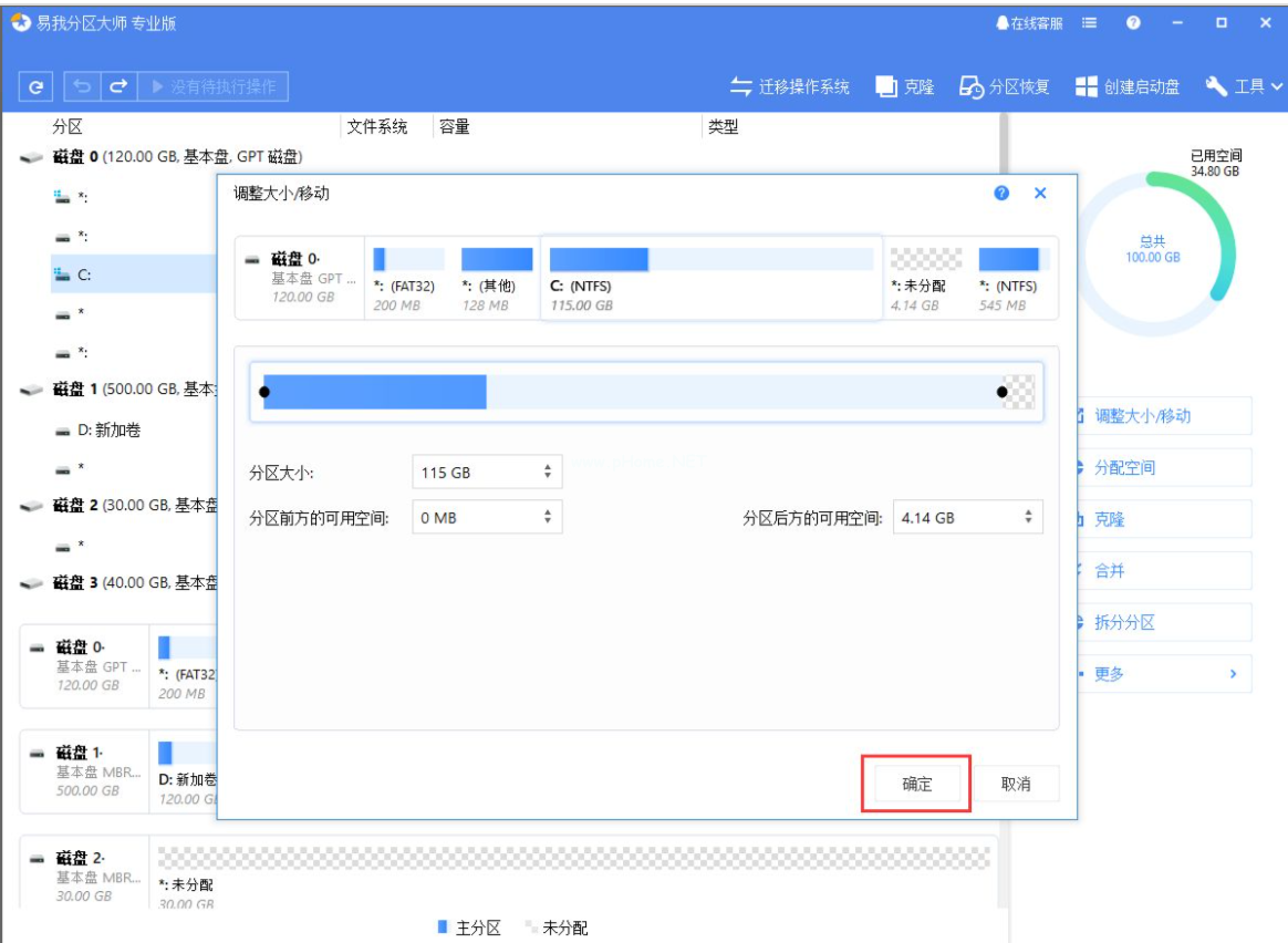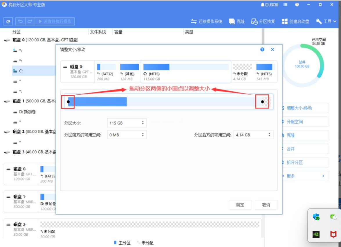 2、在彈出的“調(diào)整大小/移動(dòng)”的窗口中,拖動(dòng)分區(qū)兩側(cè)的黑色小圓點(diǎn),或通過設(shè)置“分區(qū)大小”、“分區(qū)前方可用空間”和“分區(qū)后方可用空間”,以調(diào)整分區(qū)大小或移動(dòng)其位置。設(shè)置完成之后,點(diǎn)擊確定。注意:該操作不會(huì)立即執(zhí)行,而是會(huì)先被列入待執(zhí)行操作列表。