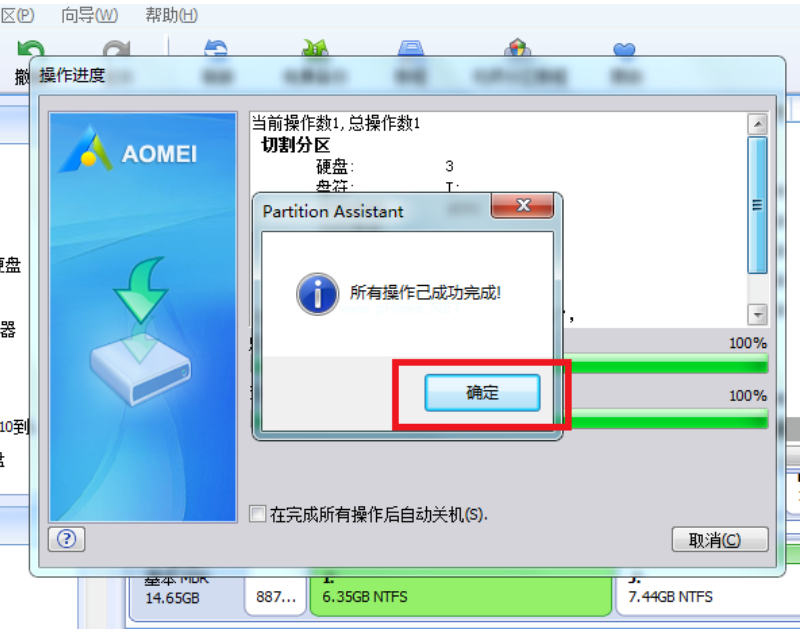 6、U盤分區(qū)成功,軟件會(huì)有提示,點(diǎn)擊確定,關(guān)閉對(duì)話框。