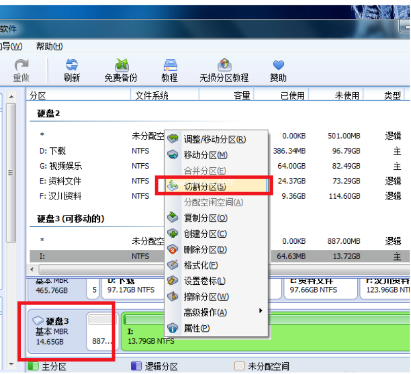 1、打開分區(qū)助手,進(jìn)入界面,你可以看到電腦上的所有磁盤,找到U盤設(shè)備(硬盤3),鼠標(biāo)右擊,彈出菜單,選擇【切割分區(qū)】。