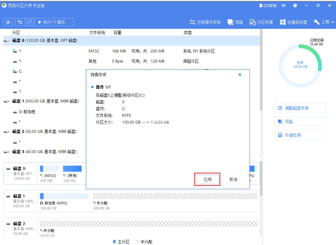 6、確定要執(zhí)行操作時(shí),點(diǎn)擊軟件左上角的待執(zhí)行操作列表,選擇“應(yīng)用”以執(zhí)行該項(xiàng)操作。