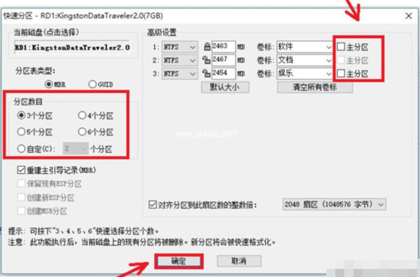 3、快速分區(qū)的設(shè)置。首先在左側(cè)選擇分區(qū)的個(gè)數(shù),然后再去掉主分區(qū)的勾選框,最后單擊【確定】進(jìn)入下一步操作。