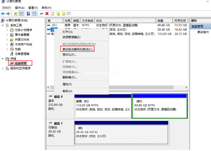 5、進(jìn)入到「計(jì)算機(jī)管理」界面,在右側(cè)「存儲(chǔ)」-「磁盤管理」,找到「可移動(dòng)磁盤」,并擊選擇「更改驅(qū)動(dòng)器號(hào)和路徑」。