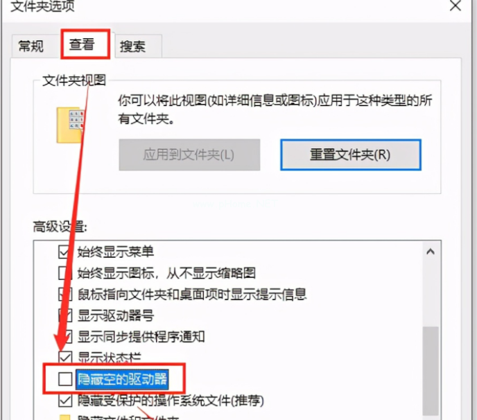 2、接著在文件夾選項(xiàng)界面,點(diǎn)擊「查看」,取消勾選「隱藏空的驅(qū)動(dòng)器」這個(gè)選項(xiàng),最后點(diǎn)擊「應(yīng)用」。