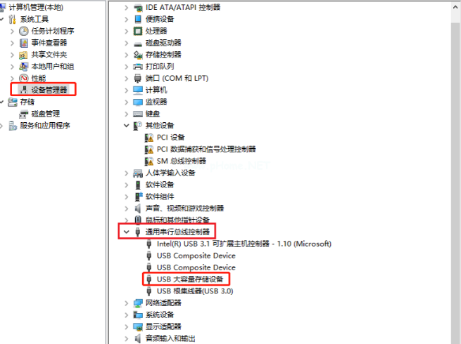 7、 依舊是先進(jìn)入到「計(jì)算機(jī)管理」界面,點(diǎn)擊「設(shè)備管理器」,找到「通用串行總線控制器」,雙擊「USB大容量存儲(chǔ)設(shè)備」。