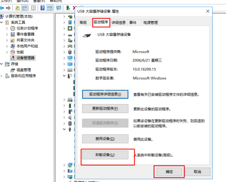 8、 接著在彈出的窗口中,點(diǎn)擊「驅(qū)動(dòng)程序」-「卸載設(shè)備」-「確定」,卸載完成之后,再將U盤重新插入電腦,系統(tǒng)會(huì)自動(dòng)加載U盤驅(qū)動(dòng),最后檢查一下U盤是否被讀取。