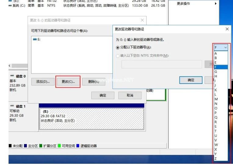 6、 接下來(lái)在彈出的窗口中點(diǎn)擊「更改」,隨便選擇一個(gè)未被占用的盤符,點(diǎn)擊確定后,電腦就會(huì)重新識(shí)別U盤并安裝相關(guān)驅(qū)動(dòng)。