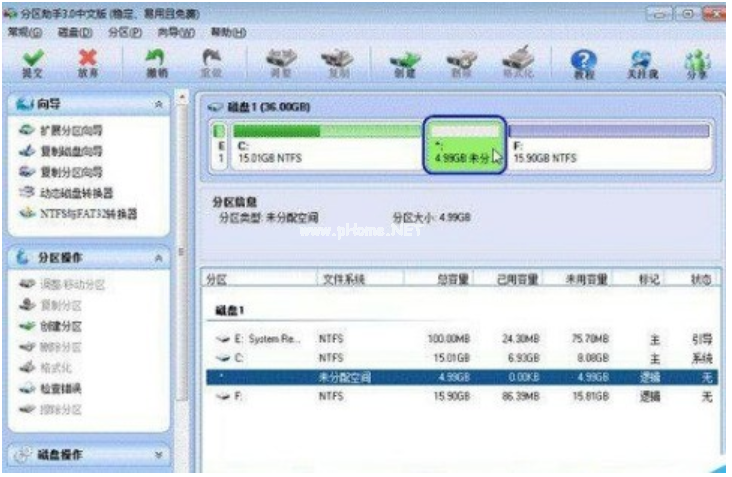 3、在點擊上圖2的確定之后將返回到主界面,同時你將看到C盤后面多出一塊大小為4.99GB的未分配空間。