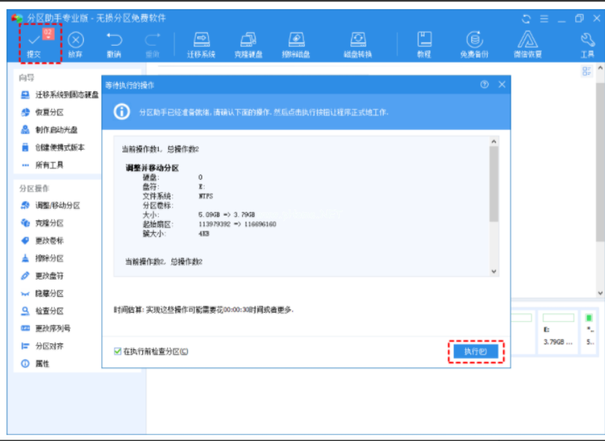 7、工具欄上有一個“提交”按鈕,請點擊它,然后,你將看到下面圖7的對話框。將點擊“執(zhí)行”按鈕來應用這兩個操作到真實的磁盤上。