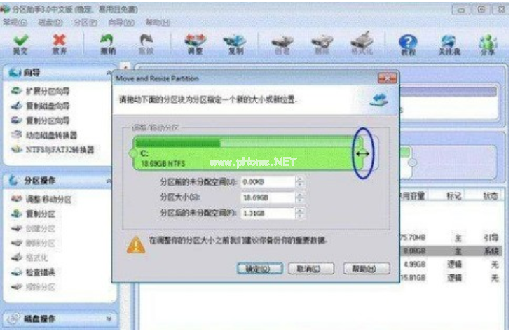5、然后將出現(xiàn)一個彈出的窗口,向右拖動右邊的手柄直到C盤被調(diào)整到20GB。