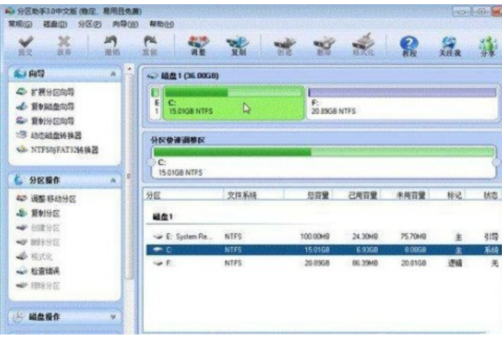 1、下載免費的分區(qū)助手,并安裝到電腦中,然后啟動它,你將看到下面的主界面,同時也可以看到C分區(qū)是15.01GB,F(xiàn)分區(qū)是20.89GB。