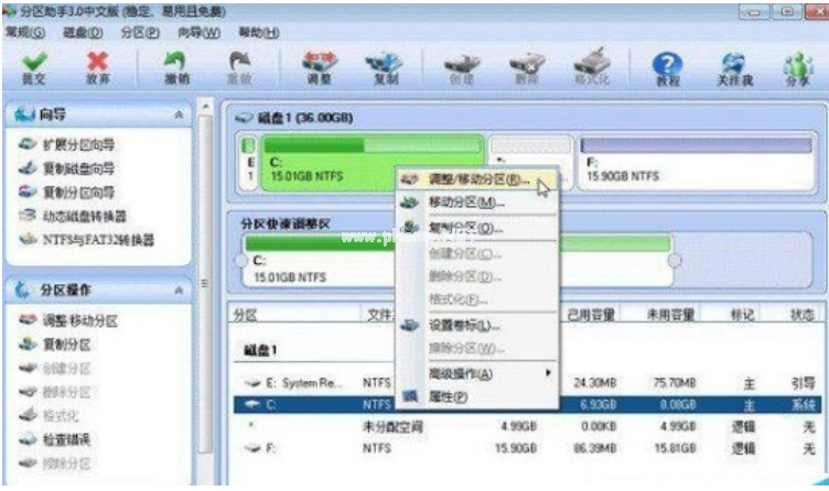 4、右擊C盤在彈出的菜單中選擇“調(diào)整/移動分區(qū)”選項。