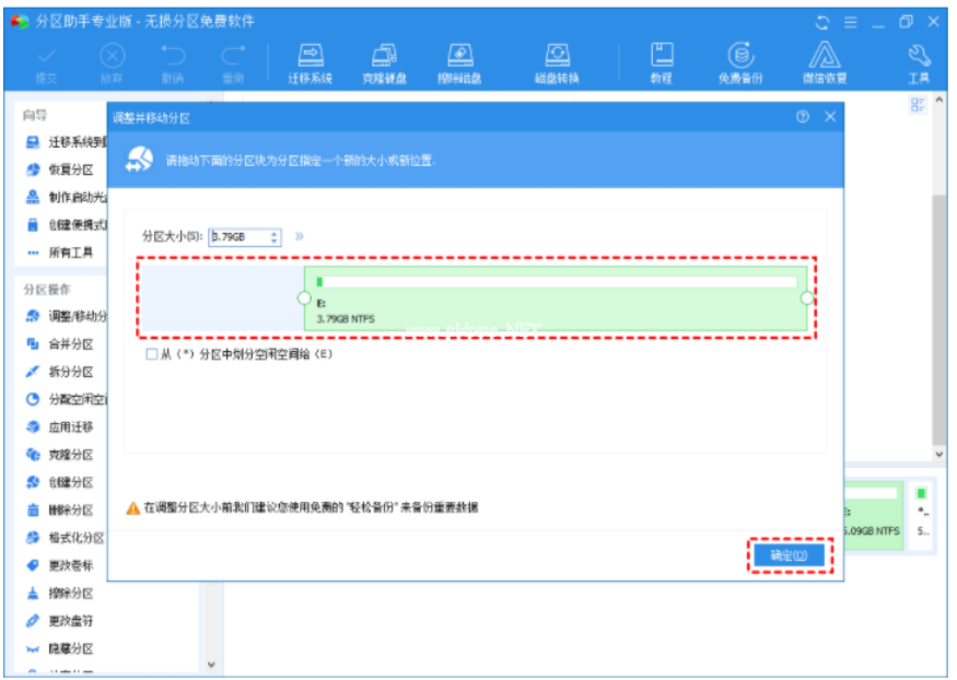 2、通過拖動左側(cè)圓形按鈕來縮小E分區(qū)大小,并點擊“確定”按鈕。