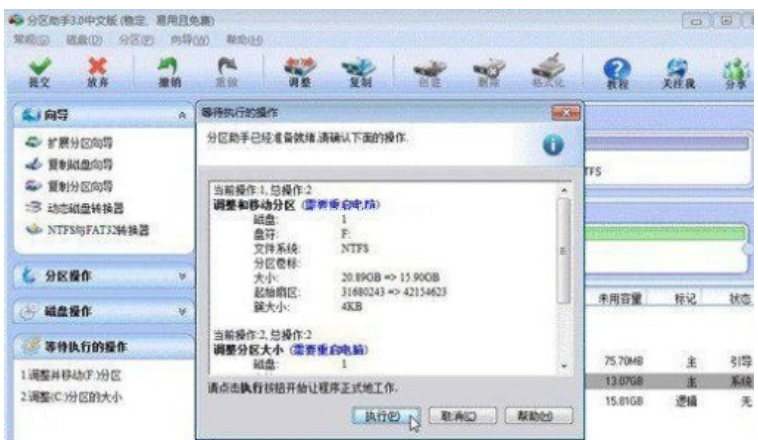 6、點擊確定后,返回到主界面??戳斜砜蛑?,這時C盤的大小為20GB,同時F盤的大小調(diào)整為15.90GB了。在主界面的左側(cè)的“等待執(zhí)行的操作”中你可以看到有兩個需要執(zhí)行的操作:一是調(diào)整并移動(F:)分區(qū),二是調(diào)整(C:)分區(qū)的大小。