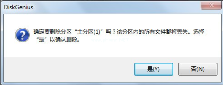 3、此時diskgenius便會提示刪除該分區(qū)文件將丟失,我們提前已經(jīng)備份好文件了,所以點擊是就可以了。