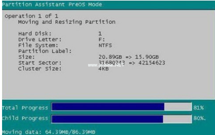 8、在點擊執(zhí)行后,分區(qū)助手可能會提示你重啟電腦在重啟模式(PreOS Mode)下執(zhí)行這些操作,這時點擊“是”以在重啟模式下執(zhí)行,但重啟模式是英文的界面,下圖是分區(qū)助手在重啟模式下的執(zhí)行狀態(tài):在重啟下執(zhí)行完成后,C盤的大小已經(jīng)被調(diào)整到20GB了。