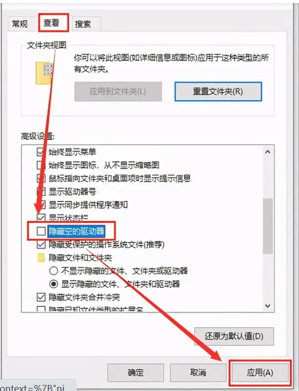 2、打開文件夾選項界面后,點擊切換查看選項卡,取消勾選“隱藏空的驅(qū)動器”,點擊“應用”即可。