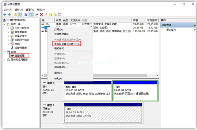 1、這個方法可以解決大部分U盤無法識別的問題。進入到計算機管理界面,在右側(cè)“存儲”的“磁盤管理”下,找到“可移動磁盤”,點擊選擇“更改驅(qū)動器號和路徑”。