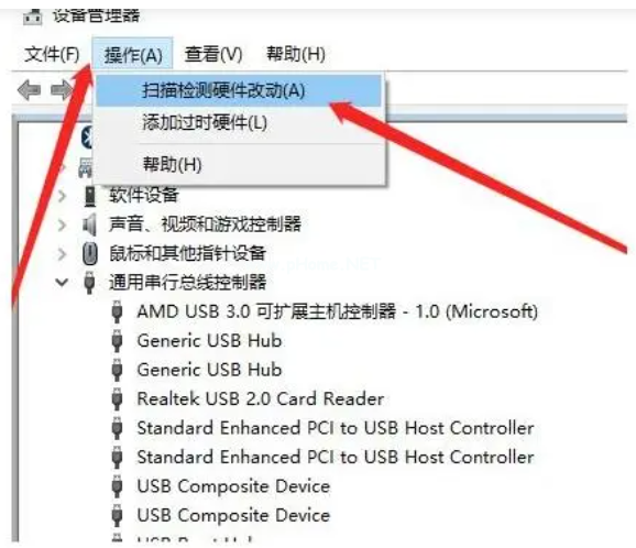 5、再點擊“操作”-“掃描檢測硬件改動”。