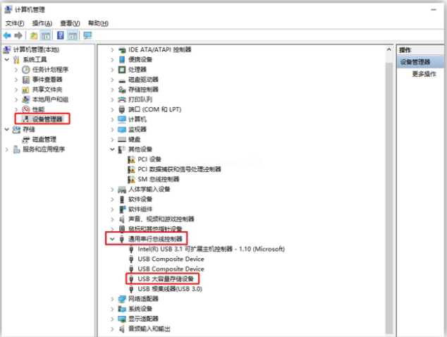 1、依舊是先進入到:計算機管理界面,點擊“設(shè)備管理器”,找到“通用串行總線控制器”,雙擊“USB大容量存儲設(shè)備”。