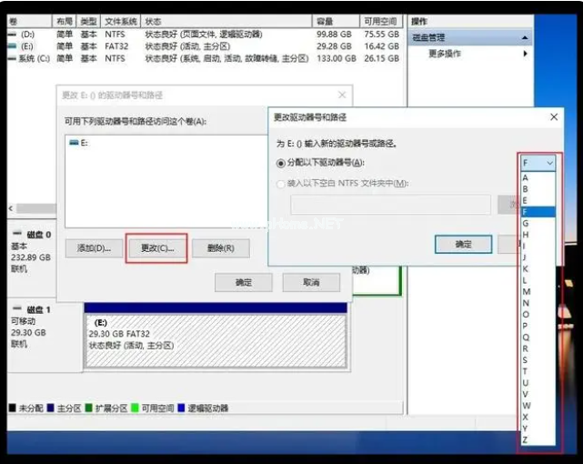 2、在彈出的窗口中點擊更改,隨便選擇一個未被占用的盤符,點擊確定后,電腦就會重新識別U盤并安裝相關(guān)驅(qū)動。