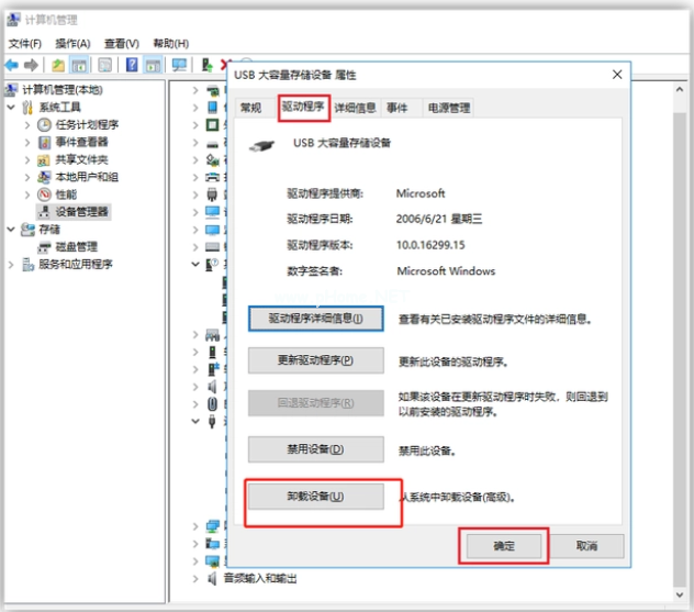 2、在彈出的窗口中,點擊“驅(qū)動程序”-“卸載設(shè)備”-“確定”,卸載完成之后,再將U盤重新插入電腦,系統(tǒng)會自動加載U盤驅(qū)動,最后檢查一下U盤是否被讀取。