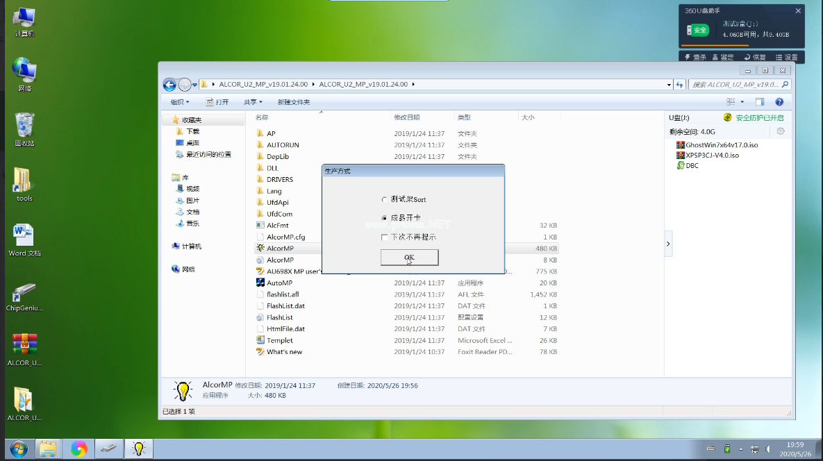 3、我們下載了安國(guó)的量產(chǎn)程序后,解壓到文件夾里,找到了AlcorMP程序。雙擊打開它。打開后有直接點(diǎn)擊確定的提示。