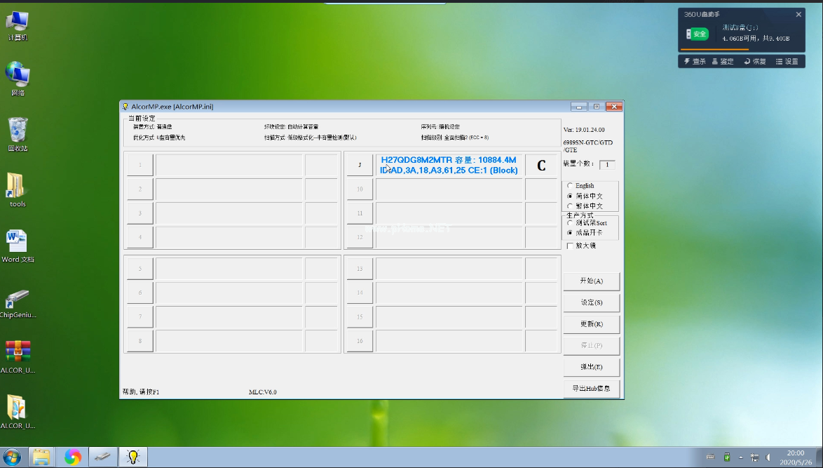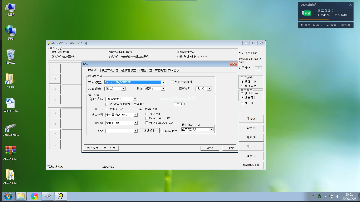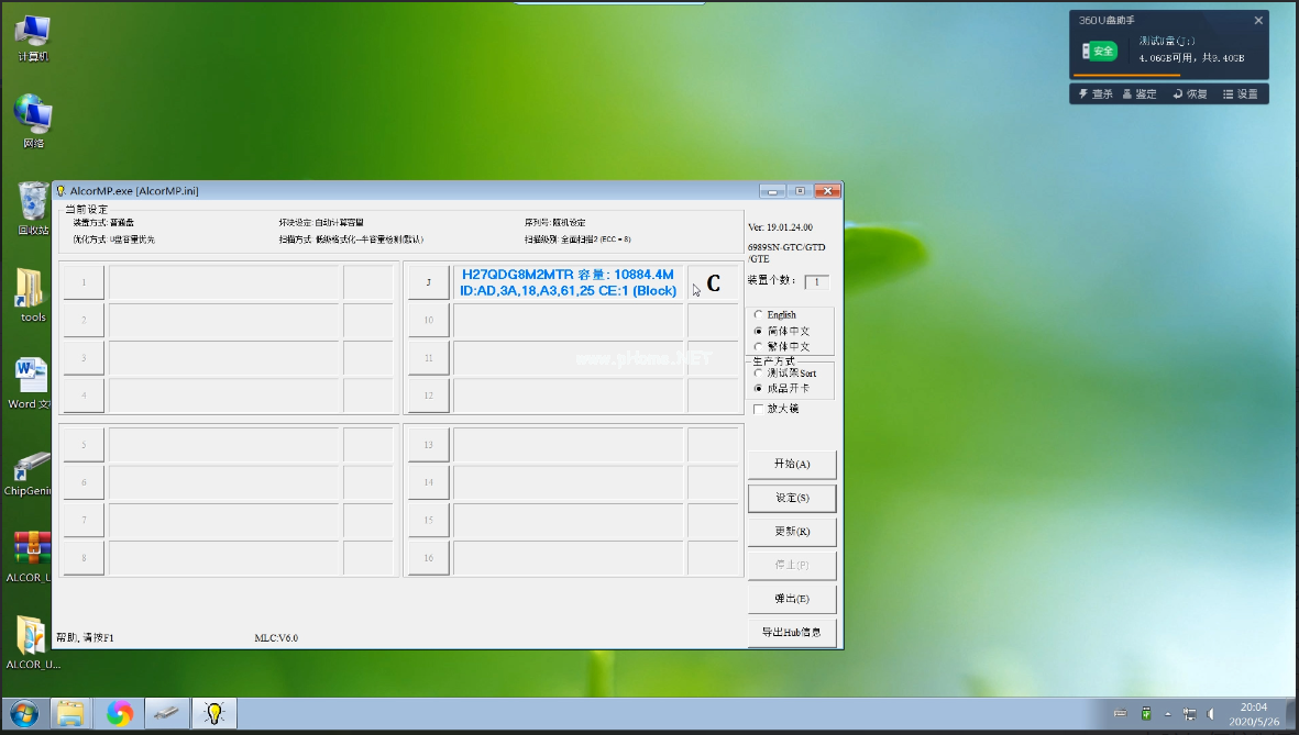 4、這樣,我們就進(jìn)入了量產(chǎn)程序,這個(gè)界面就是量產(chǎn)程序的主界面。我的電腦插了u盤,這個(gè)程序里也有顯示。然后,我們先點(diǎn)擊右下角的設(shè)置按鈕。