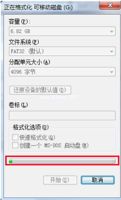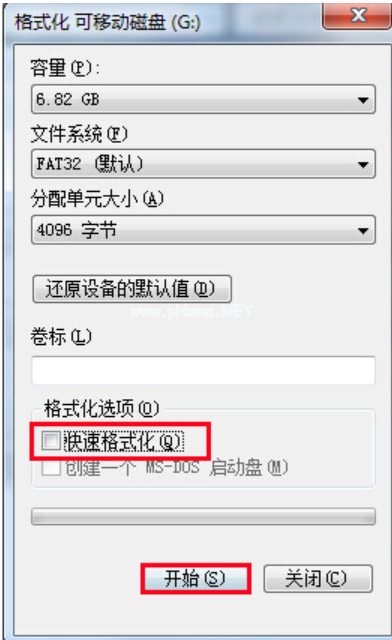 2、彈出窗口,取消勾選【快速格式化】,如下圖,點擊【開始】。