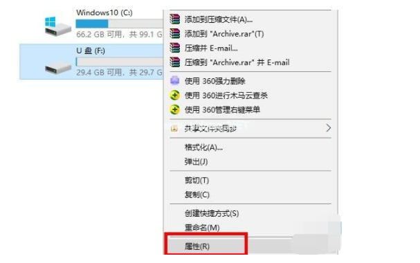 2、右擊U盤對應(yīng)的盤符,選擇屬性。