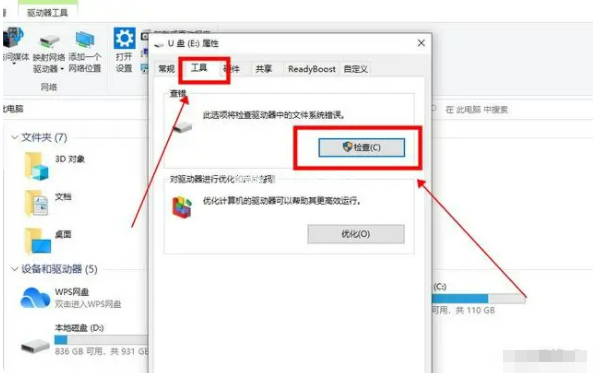 步驟3:在U盤屬性窗口界面中,點擊上面的“工具”,再選擇點擊“檢查”按鈕;