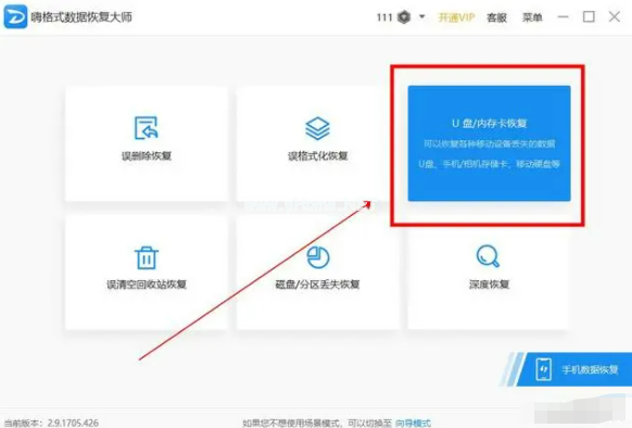 步驟1:點擊打開數(shù)據(jù)恢復(fù)軟件,我這里選擇以【嗨格式數(shù)據(jù)恢復(fù)大師】為例,在軟件的主界面中,鼠標(biāo)點擊“U盤/內(nèi)存卡恢復(fù)”模式;